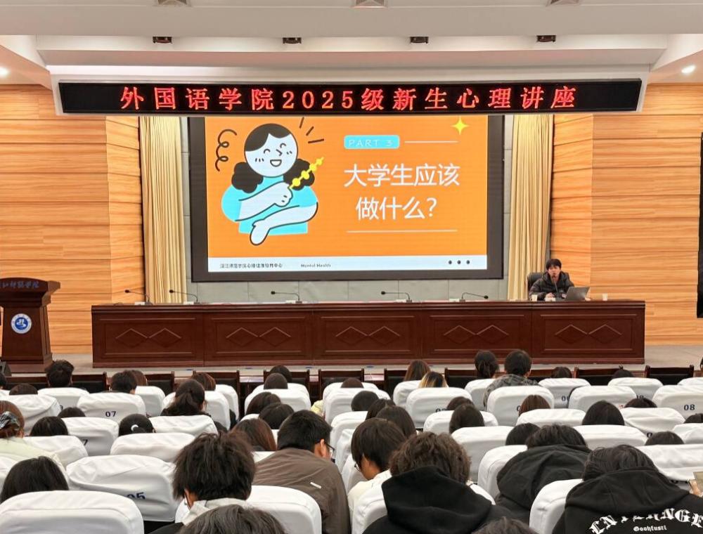 来源:院分团委、心理健康中心文字:吴璇、陈雨 图片:吴璇、毛莛杨、柯贤美为帮助2025级新生更好地认识自我、提升心理适应能力、筑牢心理健康基础,11月27日晚7时,外国语学院在文C101举办“新大学‘心’生活”心理专题讲座。本次讲座由汉江师范学院心理中心实习生王玉彬主讲,外国语学院辅导员凌爽、谭宇、陈雨及2025...