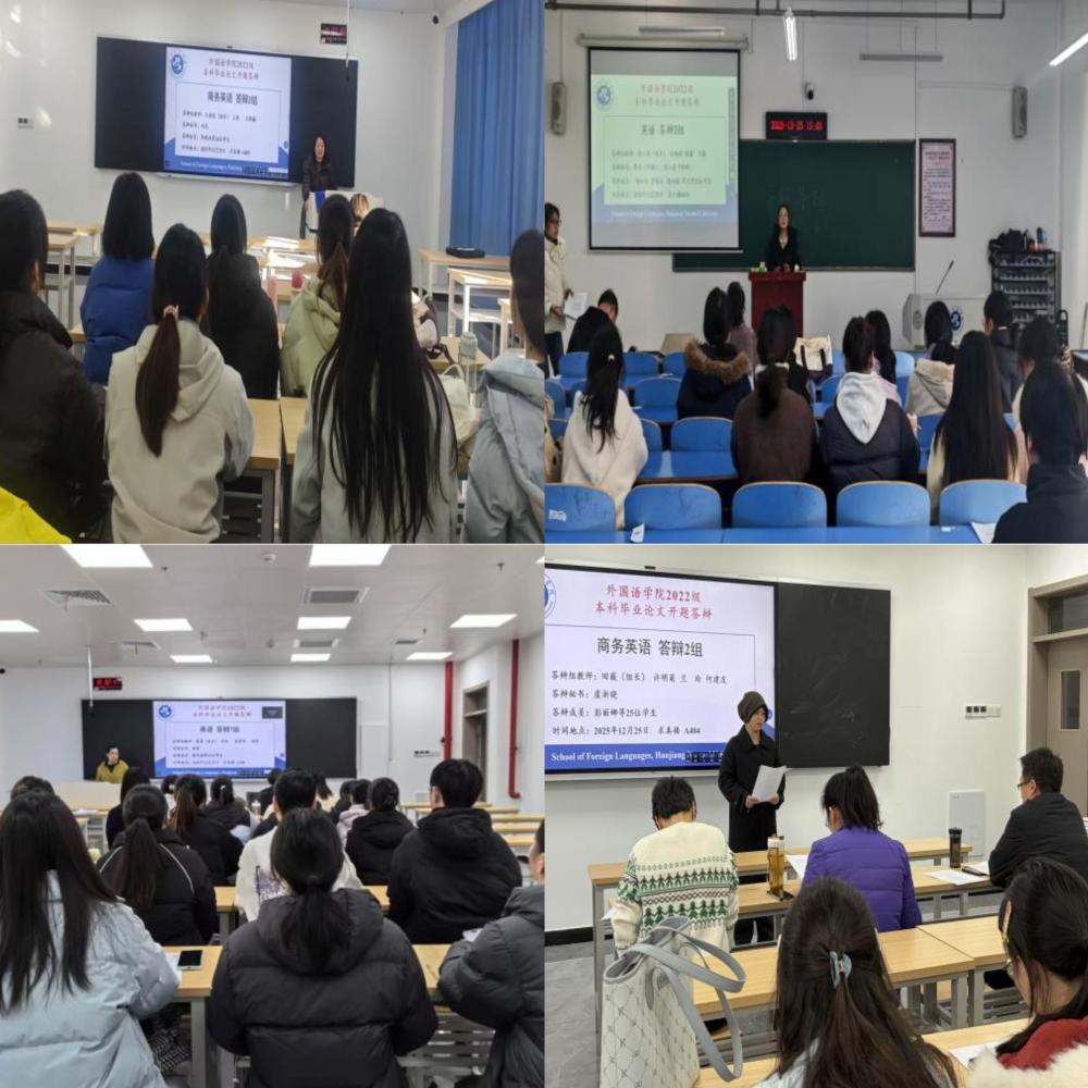 为严把毕业论文质量关,指导学生明确研究方向、规范学术思路,12月25日下午,外国语学院有序开展2026届毕业论文开题答辩。本次答辩涉及英语、商务英语、日语三个专业的284名毕业生,特邀李淑娟、袁飞、王勤、黄明星、宫雪婷等5名基础教育领域的资深英语教师担任评审专家,为学子们的学术研究提供专业指导。