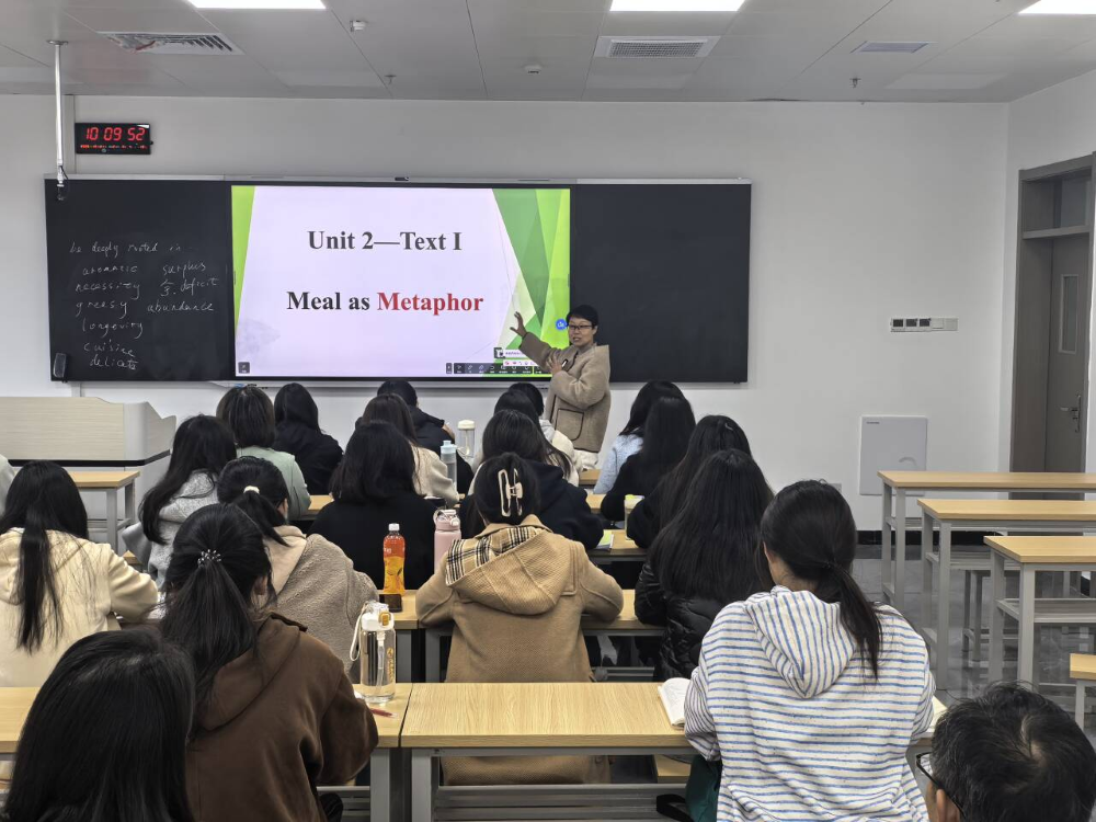本次公开课围绕第二单元“Meal as Metaphor”展开。田薇老师以英文介绍中国饮食文化的视频为切入点,紧扣单元主题,有机融入“民以食为天”的思政元素,引导学生提炼关键词与短语,有效锻炼了学生的听力能力。在主题讲授环节,她从语言学角度阐释“metaphor”的来源与定义,并结合典型例句加深学生理解。在课文讲解中,田薇老师以问题为导向,充分调动学生学习积极性,通过丰富的师生互动活动,增强了学生对课程内容的理解与掌握。