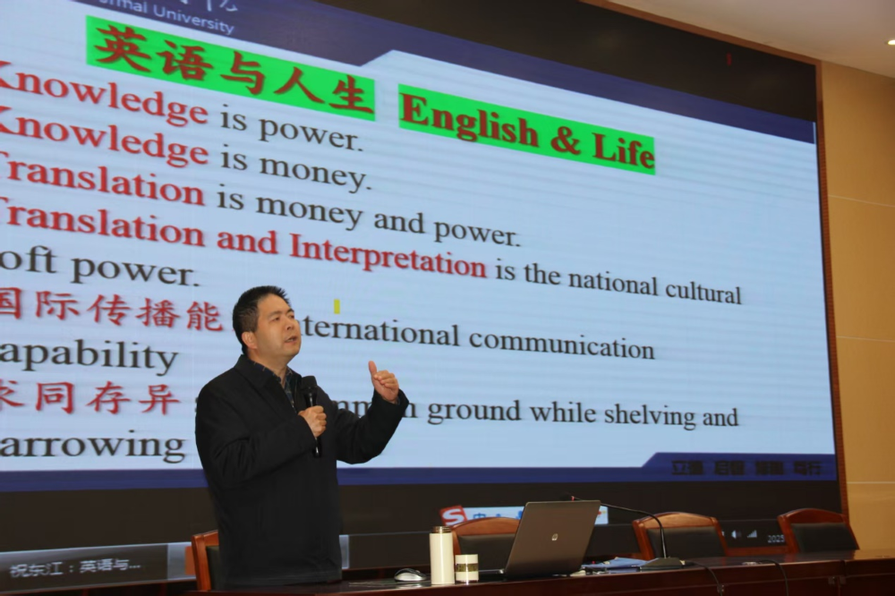 25 日下午,外国语学院领导和教师深入武当山中学八年级课堂开展听课调研,全面了解该校英语教学实际情况。当晚,院长祝东江受邀以“英语与人生”为题为武当山中学七年级学生作励志专题报告,通过双语分析学好英语的重要性,分享自身成长经历与优秀学子案例,鼓励在场学生增强信心学好英语,勇于开口讲英语、扎实学好用好英语,为武当文化走出去贡献自己的力量,现场互动频繁、氛围热烈,为师生带来深刻思想启发。