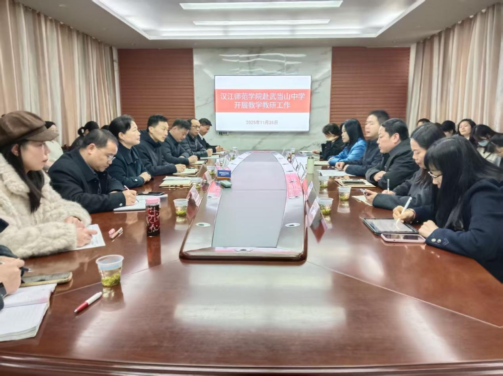 11月 25 日至 26 日,外国语学院院长祝东江、教务处副处长朱琳一行赴武当山中学开展教学教研活动,落实深化校地教师教育共同体建设。武当山特区教育局副局长崔星、武当山中学党总支书记梁庆、校长马成珍、及太极湖学校领导老师参与相关活动。