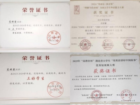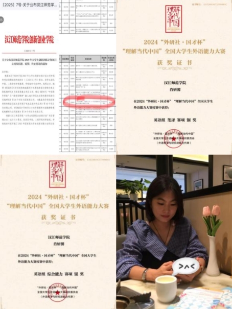 深耕专业领域,大二学年专业成绩稳居年级第一,斩获校三等奖学金、“三好学生”、“优秀团员”等荣誉;专业能力持续精进,顺利考取普通话二甲、英语四级、英语专四证书,在“国才杯”笔译赛项获得校银奖、综合能力赛项获得校银奖、省优胜奖、“高教社杯”用英语讲好中国故事短视频大赛拿下省团体二等奖的佳绩,牵头的大学生创新创业训练项目获国家级立项。