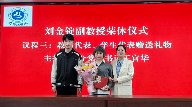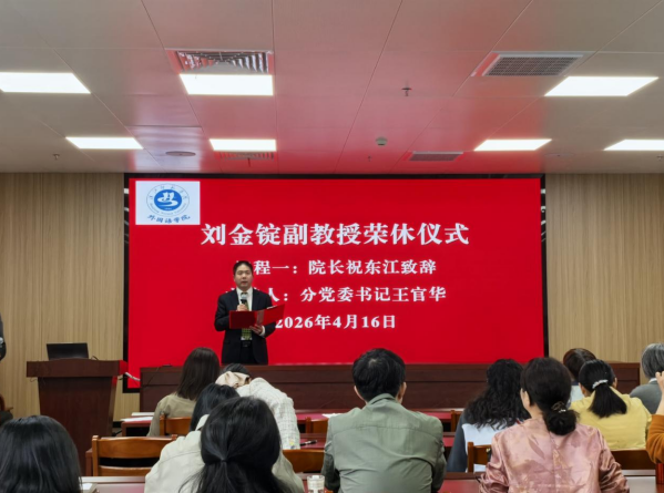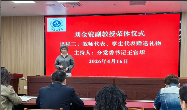 4月16日下午,求真楼7楼外国语学院会议室里,春意融融,真情涌动。外国语学院全体教职工与学生代表齐聚B701,为刘金锭副教授举行了一场温情而隆重的荣休仪式。分党委书记王官华主持仪式,院长祝东江、副院长齐雁飞、冯晓华全程出席,现场掌声与泪光交织,敬意与不舍同在。