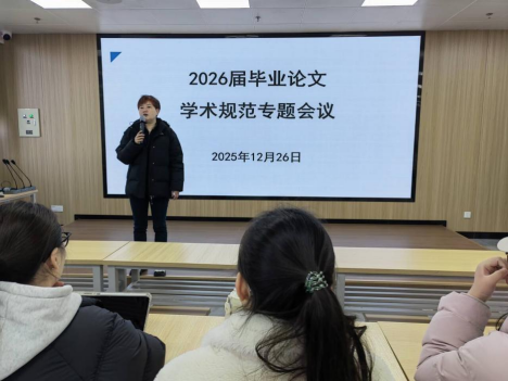 副院长齐雁飞对三位代表的实习成果及总结汇报予以高度评价,充分肯定了2026届毕业生在实习过程中付出的努力和取得的成绩。随后,为帮助学生顺利完成学业最后一环,开展了毕业论文专题培训。培训结合外语类专业特色,围绕毕业论文撰写的关键环节展开,系统讲解了时间安排、选题方向、格式规范与写作技巧等核心内容,并重点强调了学术诚信的重要性,要求学生严格遵守学术规范,坚决杜绝任何不端行为。整场培训内容详实、针对性强,为同学们后续高效、规范完成毕业论文提供了扎实指导。